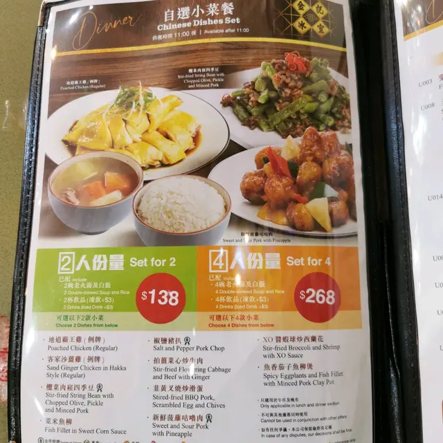 餐牌厚得像一本書,菜式選擇多樣化,都是港式美食,令人的選擇困難症復發。我們樣樣都想食,最終點了一個小菜二人餐、一個焗飯、一個鐵板扒。