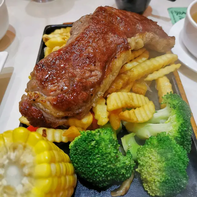 鐵板西冷牛扒薯菜,薯仔是經典波浪厚切,份量很足,牛扒又厚又大塊,是大胃皇的必食推介!