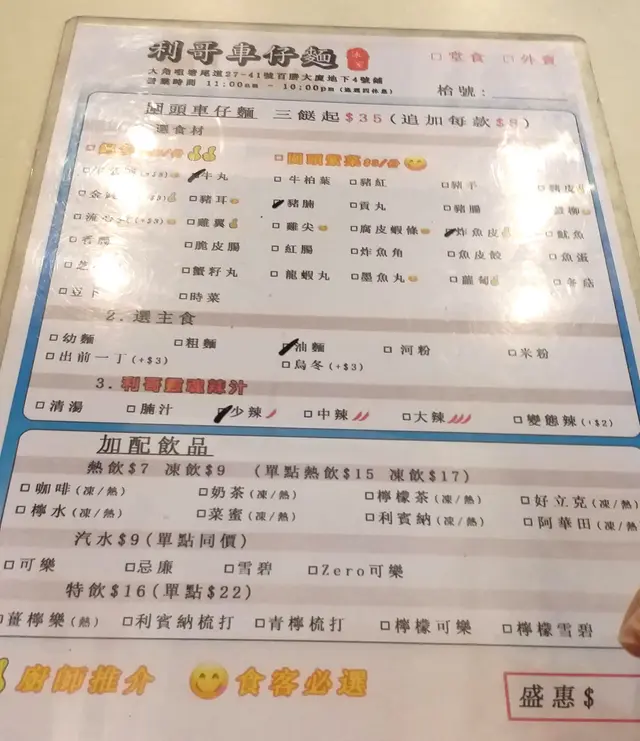 點餐是用膠餐牌再用白板筆自己劃。車仔麵餐包三餸起,選擇也不少,試新車仔麵當然要試炸魚皮吧!炸魚皮做得好,其他的都不會太差,就以炸魚皮作為基本測試之一。另外點了牛丸,還有...... 豬腩? 很少見的選擇 (還是我少食車仔麵?),就要豬腩。