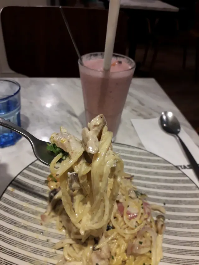 在我食完一口「LIFETASTIC」鹹味比較濃厚的「咸蛋黃蕈菇雞肉意大利麵」,再喝一口味道偏向比較酸的「雜莓奶昔」飲品,「雜莓」裡面的酸味令「咸蛋黃蕈菇雞肉意大利麵」「鹹蛋黃」鹹甜味道感覺不會變得太過量。