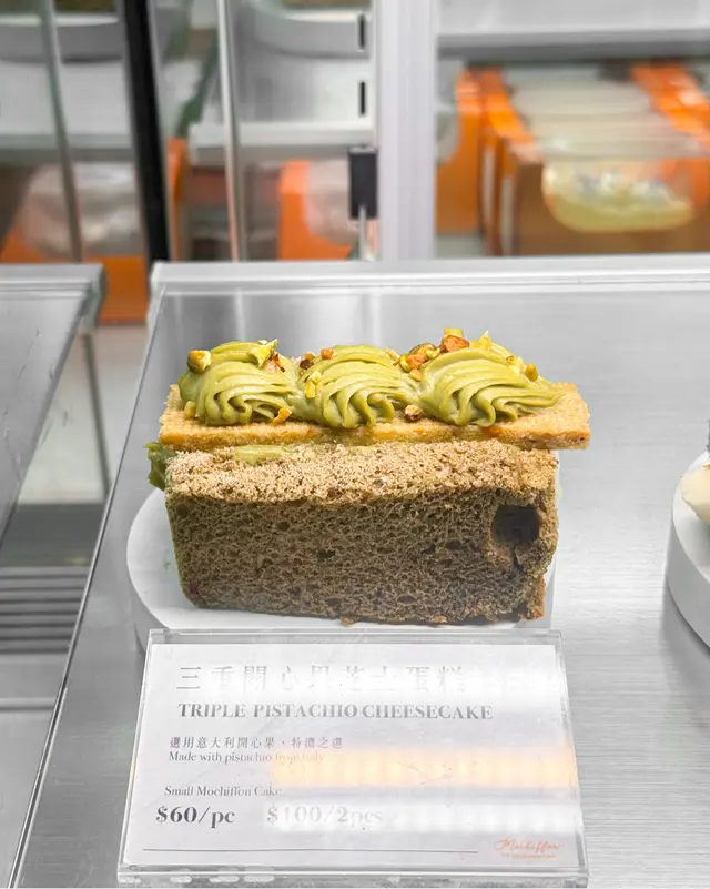 三重開心果芝士蛋糕 $60 內餡:鬆軟戚風蛋糕/招牌煙靭麻糬/香滑濃郁開心果芝士餡/開心果酥脆餅/開心果碎