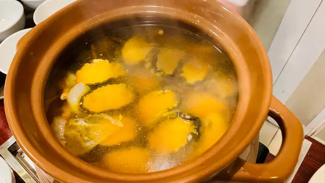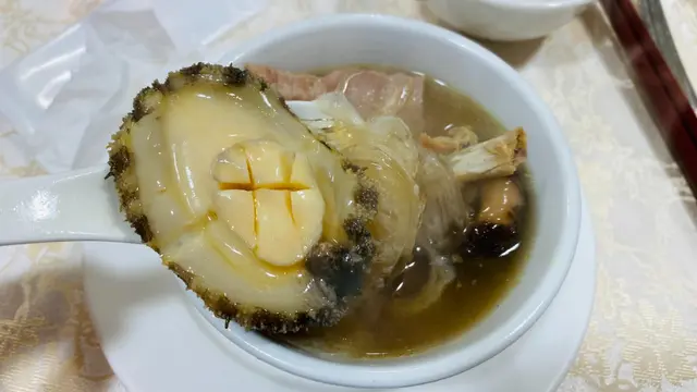 2. 原隻鮑魚佛跳牆:皇仁舊生話呢道係佢哋叫做「例湯」!服務生拎一大鍋擺咗上嚟,一開蓋,香氣四溢。見到12隻鮑魚整齊排列,一人一隻唔使爭,仲有魚翅加上大大件金華火腿、大量豬肉,超香超入味!