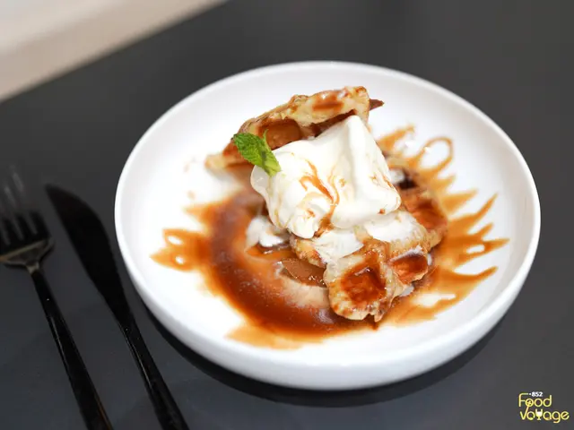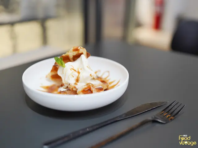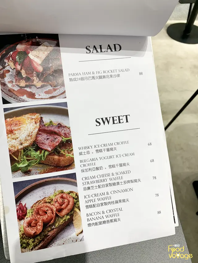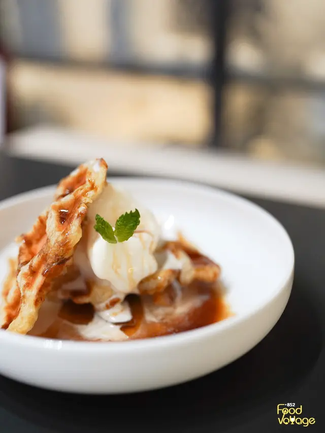千層窩夫即叫即製,上桌已經聞到威士忌的酒香,作為醬汁的它淋上非常脆的croffle上完全不會影響口感,酒微微的苦澀和焦糖很調和,點上超級冰的雲呢拿雪糕,入口瞬間真的會眼睛一亮!值得加分是底下還有散發玉桂香的蘋果肉增加果味,很有驚喜的組合。