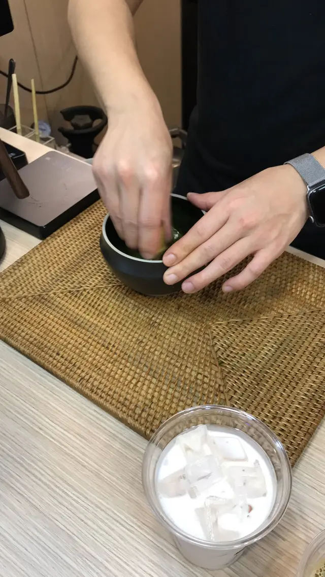 師傅注入熱水,用茶筅沏茶,欣賞著日式茶道藝術,焙茶香氣與淡雅鮮奶柔和融合,微微甘甜,輕盈口感。