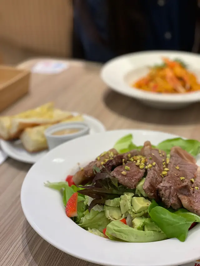 點了美國特選西冷牛扒牛油果士多啤梨沙律。當牛扒端上桌時,香氣撲鼻而來,鮮豔的顏色令人食慾大增。西冷牛扒由於烹煮過熟,肉質稍有點韌,但味道不賴。配上牛油果士多啤梨沙律,清新的口感讓我倍感滿足,特別是淋上日式芝麻沙律醬後,口感更是清新。再搭配香脆的蒜蓉多士,簡直是完美的組合,令人回味無窮。配合大量不同的生菜,十分健康!