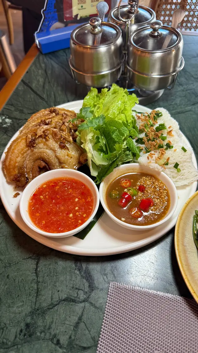 🥓 脆皮燒腩肉:薄切煙靭腩肉,鹹香味濃郁,配特製醬汁+生菜+米粉,泰越風味滿分!