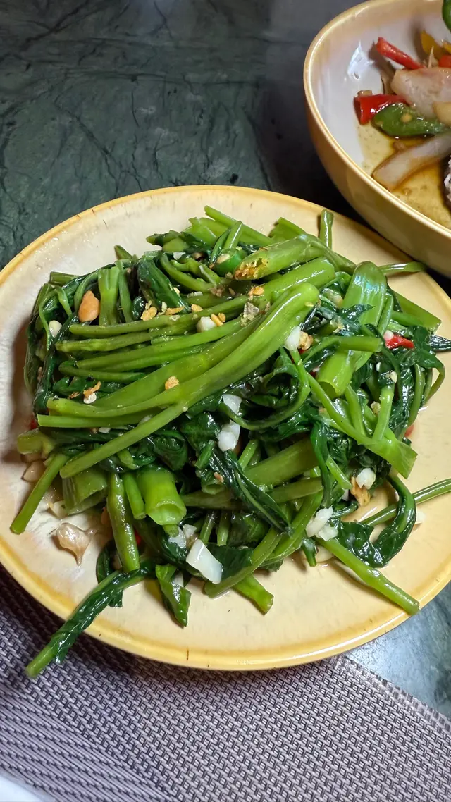 🌿 馬拉盞通菜:新鮮脆嫩,蒜蓉+辣椒炒香,微微的辣味,香辣惹味!