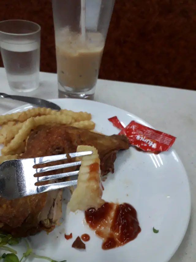 我發現「幸福茶餐廳」廚房炸出來的「炸脆香雞髀」,雞髀上半截裡面連着的雞腿肉,沒有被餐廳在準備其他食品食材的時候,預先把雞髀連着的雞腿肉切走,沒有令「炸脆香雞髀」的實際雞肉份量打了折扣。