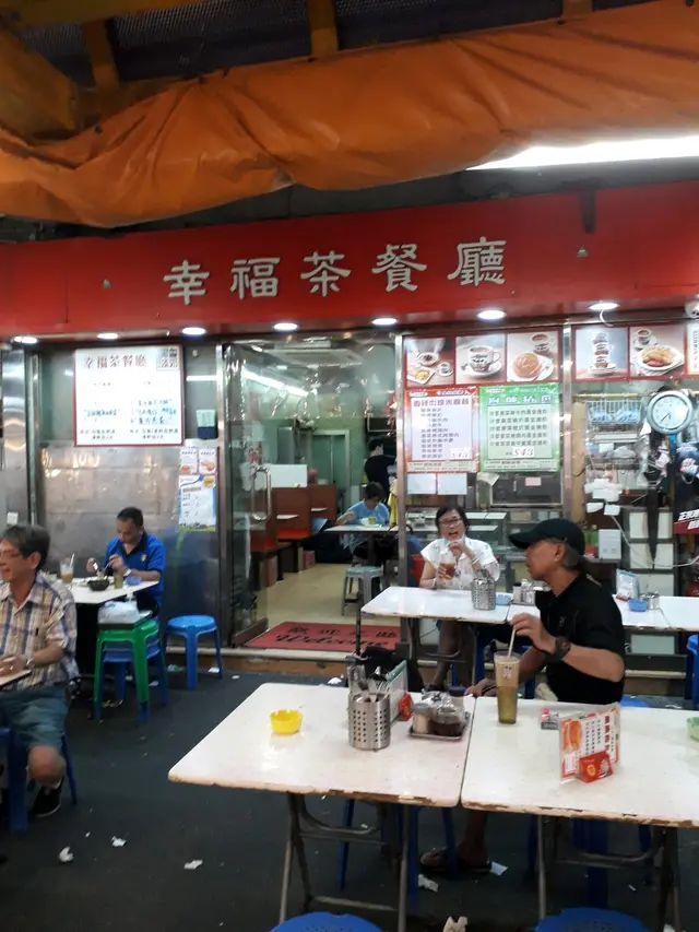 這一間「牛池灣鄉」裡面的港式茶餐廳的名稱,叫做「幸福茶餐廳」。雖然「幸福茶餐廳」本身的名稱被店主設定叫做「幸福」,但實際上「幸福茶餐廳」跟「必X茶餐廳」一樣,餐牌都沒有提供類似「鴛鴦扒」的食品。