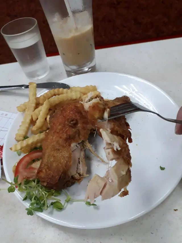 但是由於「幸福茶餐廳」廚房裡面的人,把「雞髀」裡面的雞髀劏開,變成了類似薄切雞肉,所以把雞肉炸熟的實際需要時間比預計少,雞肉的實際製成品熟度還是剛剛好,口感也偏向比較嫩滑。