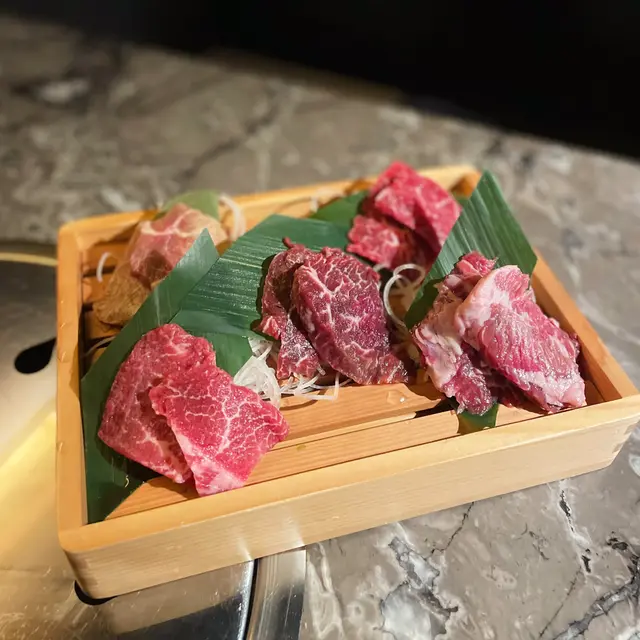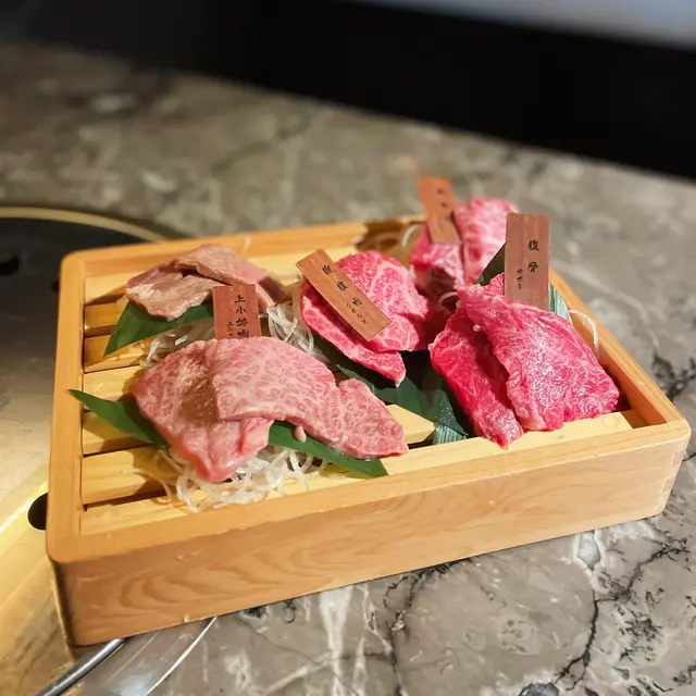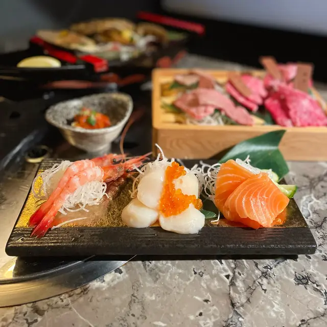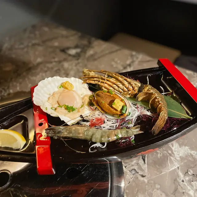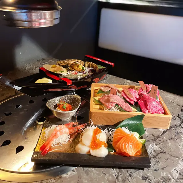 包括泡菜豆腐、鹿兒島A4和牛拼盤(A4牛小排➕A4牛横隔肌➕A4牛腹脅➕A4牛胸腹➕牛舌)、海鮮船(越南虎蝦、帆立貝、鮑魚、青龍蝦)、三點刺身 (三文魚、帶子、甜蝦)、三文魚味噌湯、燒鬼飯