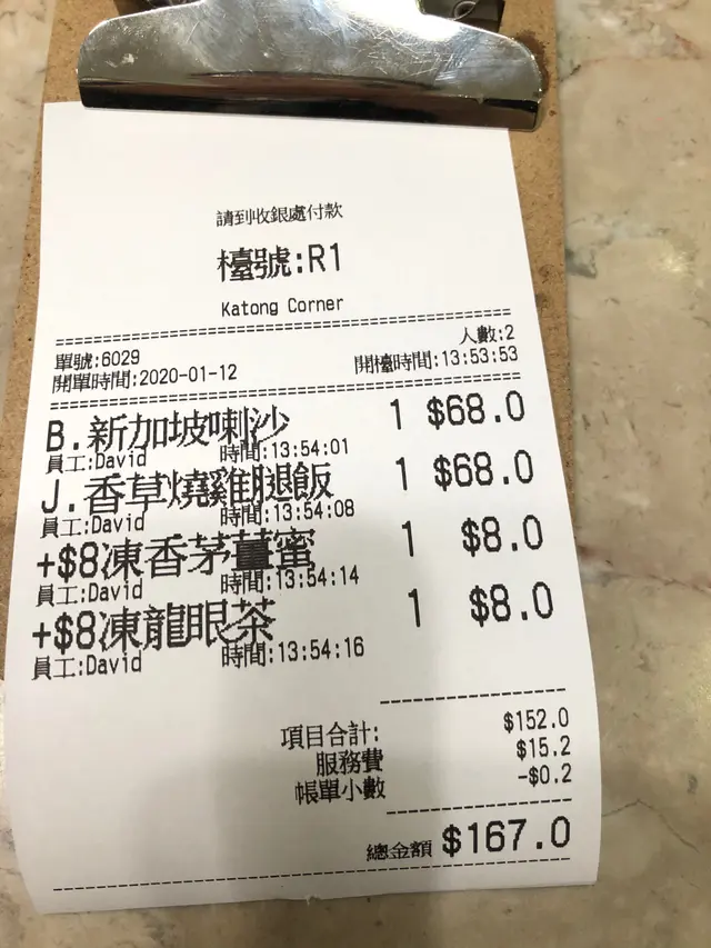 抵食新加坡菜 fahrenheit319等级22020-01-12427 浏览 关注 星期日嚟九龍灣行下,search到呢間新加坡菜新開上嚟試下。大概兩點啱啱過午飯時間,唔洗等位,喺門口等咗一陣等佢安排就入得。環境乾淨,座位都幾闊落舒服。侍應態度幾好又快手。1同老公嗌咗一個飯一個喇沙,加一人一杯嘢飲。新加坡喇沙喇沙湯底好香椰汁味,夠哂香濃,都幾足料。香草燒雞腿飯香草燒雞髀飯呢,個雞係幾脆幾香口,亦有香味,不過略嫌乾咗啲,無乜肉汁,加上個飯無汁,所以成件事就好dry。好在有個冬瓜湯,可惜味精有啲多,都入得口嘅。龍眼冰香茅蓮蜜我杯香茅薑味好夠薑不過唔係好蜜,飲到喉嚨都辣,如果天氣凍飲熱嘅應該幾正。埋單我覺得幾抵食,有機會可以再嚟試下晚市咖喱啊,胡椒蟹之類以上食记乃用户个人意见 , 并不代表OpenRice之观点。赞好分享抵食新加坡菜 加東 (德福廣場) https://s.openrice.com/QrLT0p7yRW0检举 张贴 评分4味道4环境4服务4卫生5抵食推介美食龍眼冰新加坡喇沙用餐日期2020-01-12用餐途径堂食人均消费$70 (午餐)
