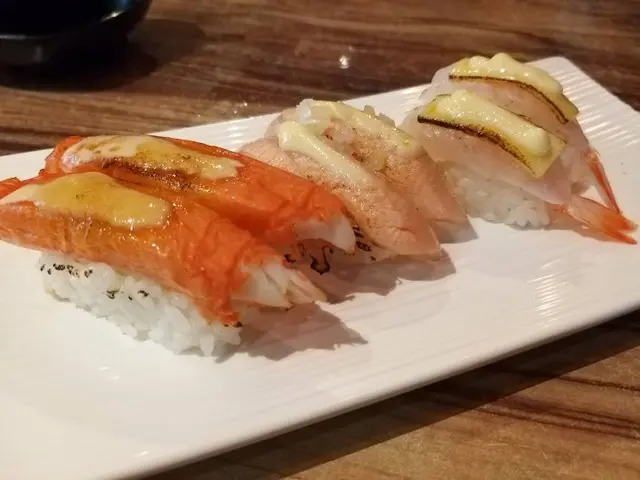 火炙壽司,三文魚,和牛和左口魚,火炙後油脂走進飯裡,好食到停不了口!