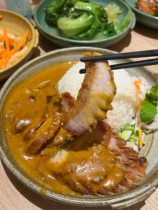 勁正🤤🤤🤤豬頸肉厚切夠份量,面頭烤到微焦香口,咬落軟腍又多汁!咖喱汁椰香味濃,香料層次分明又唔會太辣,撈飯食勁好味!