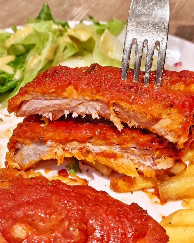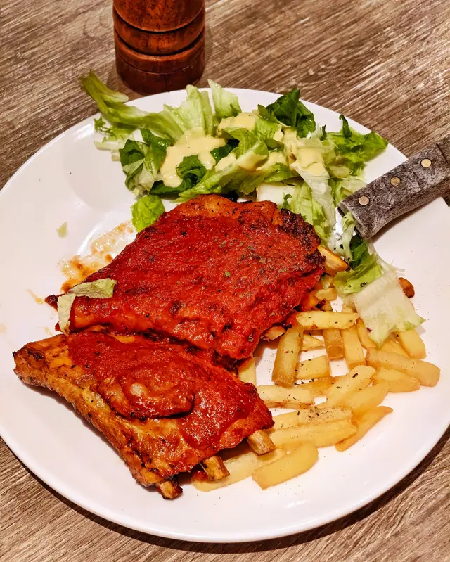 BBQ烤原條豬仔骨🍖配薯菜,大大條豬仔骨真係勁驚喜,🐖骨肉分明,軟腍腍咁,吸晒BBQ醬汁嘅香味,好入味🔥,加上沙律菜同薯條🍟,份量豐富好足料。