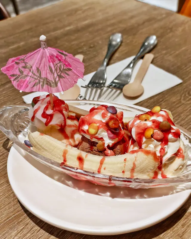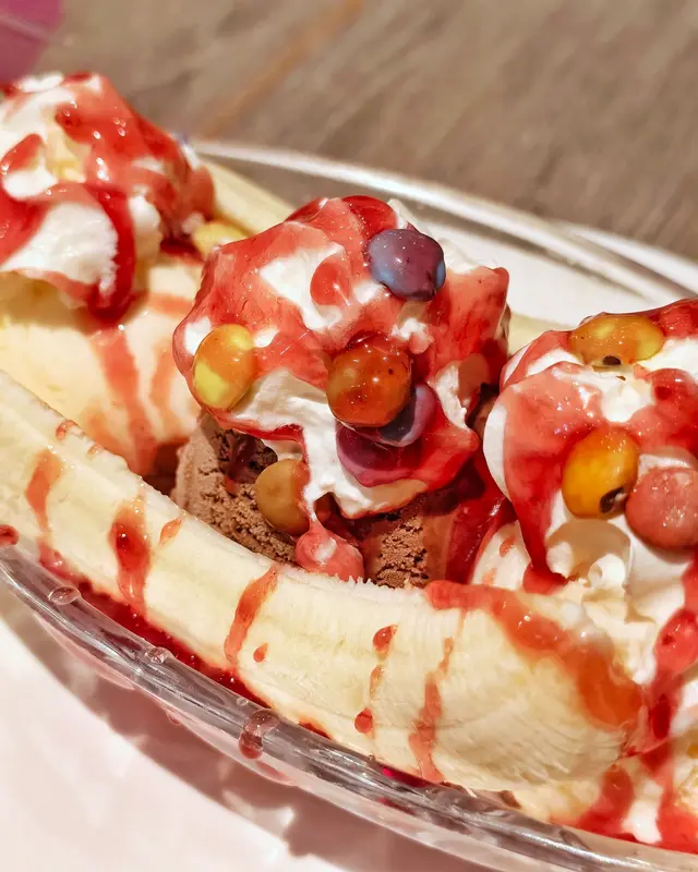 最後嘅甜品係懷舊香蕉船🍌,軟腍嘅香蕉上邊有雲呢拿同埋朱古力雪糕球🍨,淋滿奶油同士多啤梨醬🍓,再加上脆皮朱古力豆🍫,每一口都充滿童年回憶,正呀😊!