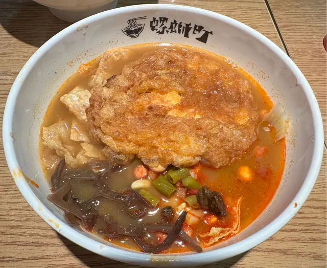 招牌柳州螺螄湯粉+ 招牌炸蛋:份量少 配料有酸筍 腐竹 花生 木耳 酸豆角 生菜 螺肉 這家的湯粉份量不大口感偏稔偏黏 湯汁偏咸 酸荀更是超級咸 湯內有少量螺肉和配料 炸蛋要加$10 炸蛋也偏細小偏乾 花生不脆 整體味道偏咸不好 不推薦