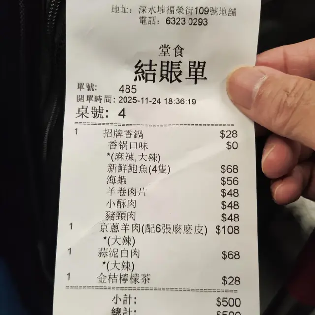 食物推介:招牌香鍋 $28 (麻辣,大辣) [配新鮮鮑魚(4隻) $68, 海蝦 $56, 羊卷肉片 $48, 小酥肉 $48, 豬頸肉 $48],京葱羊肉(大辣) (配6張麼麼皮) $108,蒜泥白肉(大辣) $68,金桔檸檬茶 $28