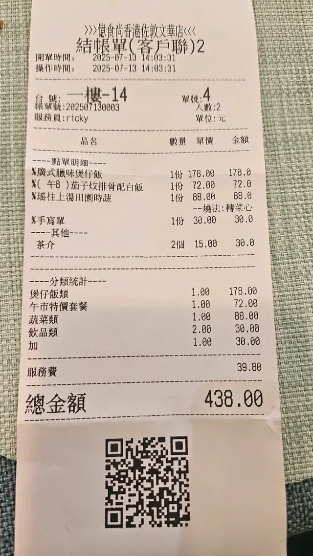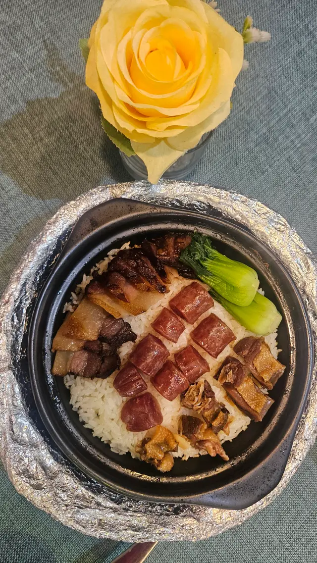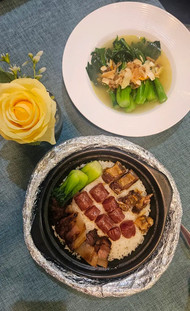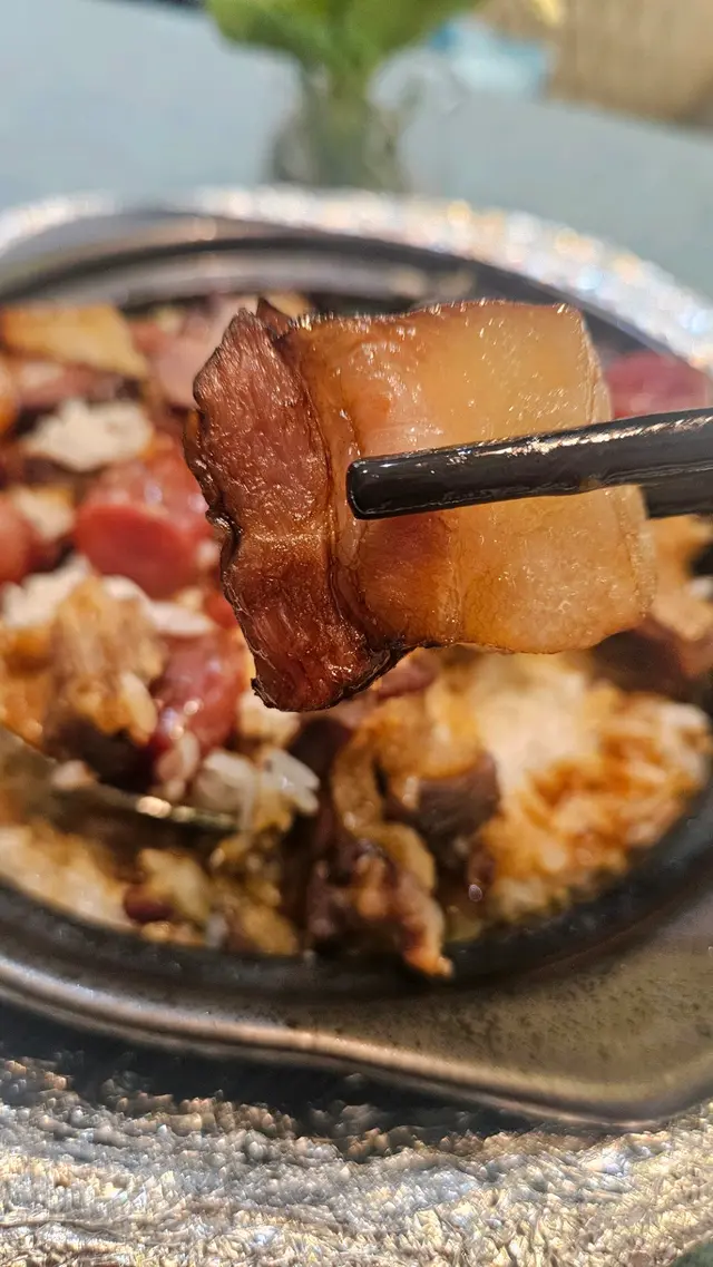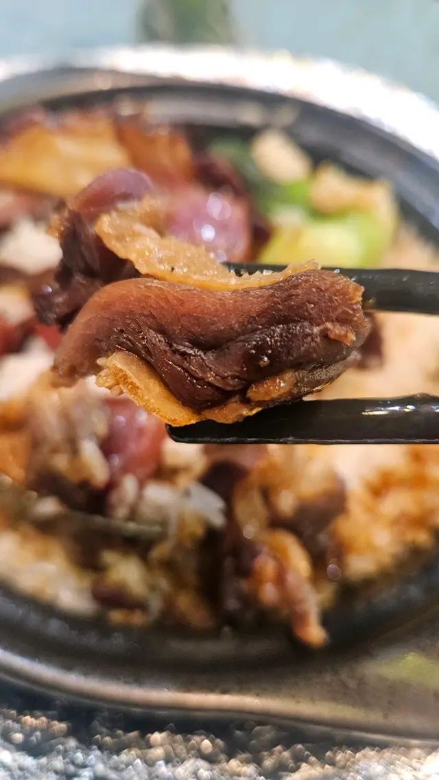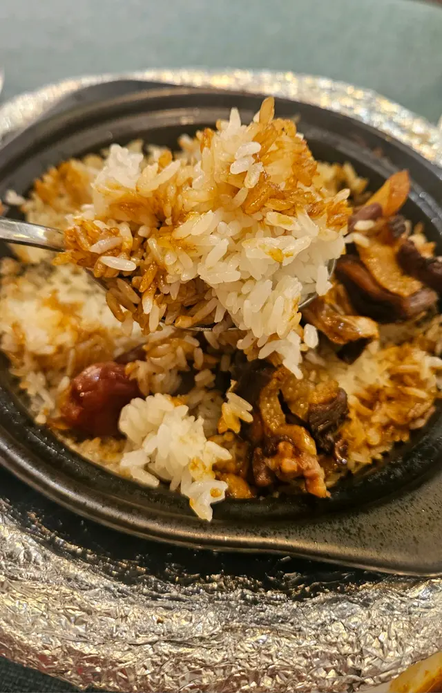 一上桌就聞到濃郁的臘味香氣!臘腸油潤甘甜,咬下去微微爆油;臘肉鹹香帶煙燻味,肥瘦適中,不會太膩。米飯選用細長絲苗米,粒粒分明,吸飽臘味的油脂和醬油香,底部飯焦(鍋巴)金黃酥脆,淋上店家特調甜醬油,拌勻後每一口都充滿臘味、米香和焦香,層次豐富!
