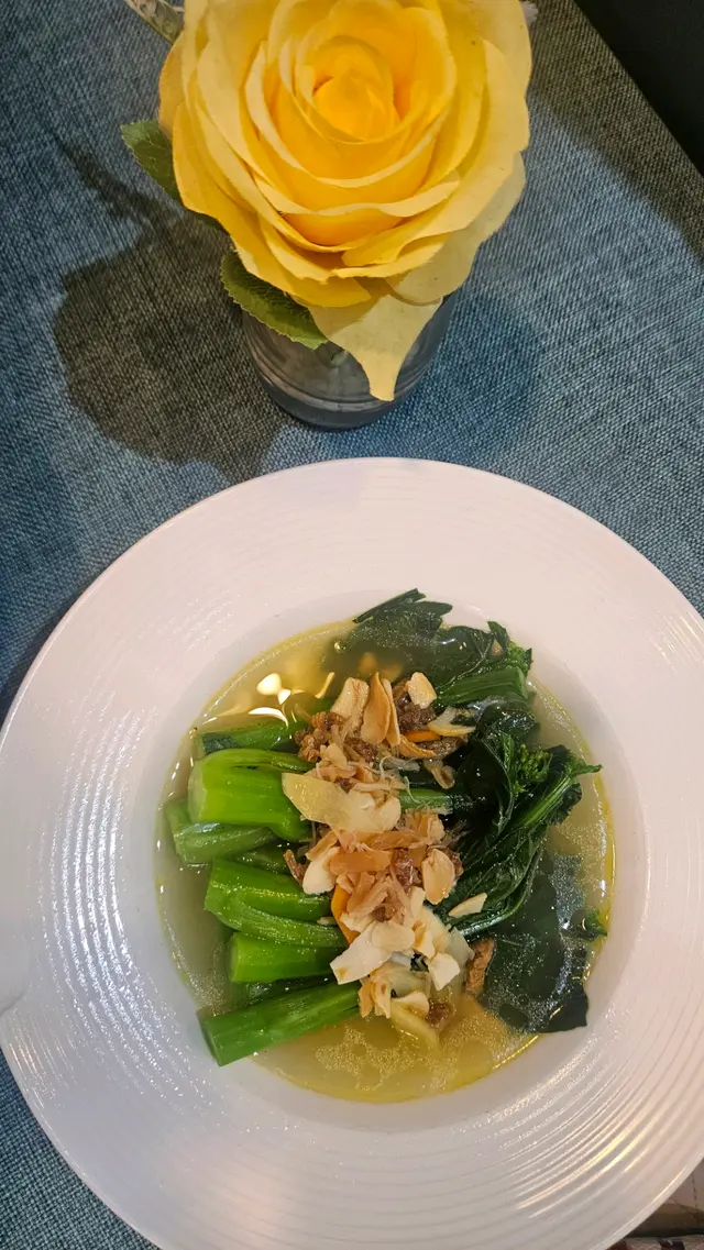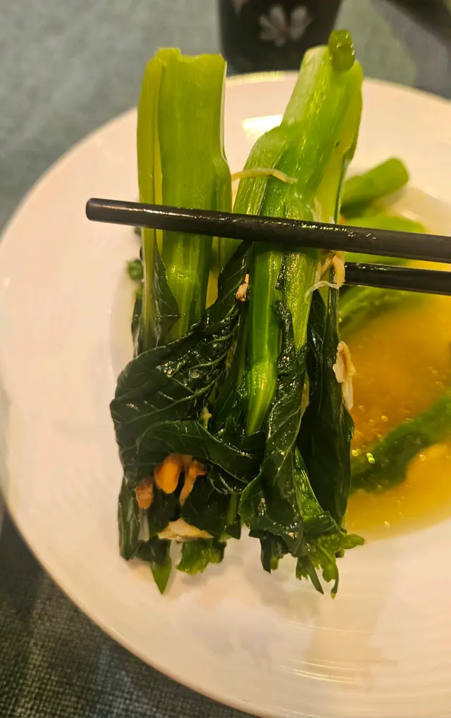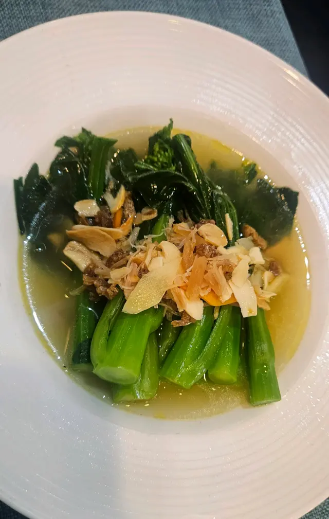 菜心煮得翠綠爽脆,瑤柱絲點綴其中,增添口感與鮮味。整道菜清新解膩,清爽卻不失鮮美!