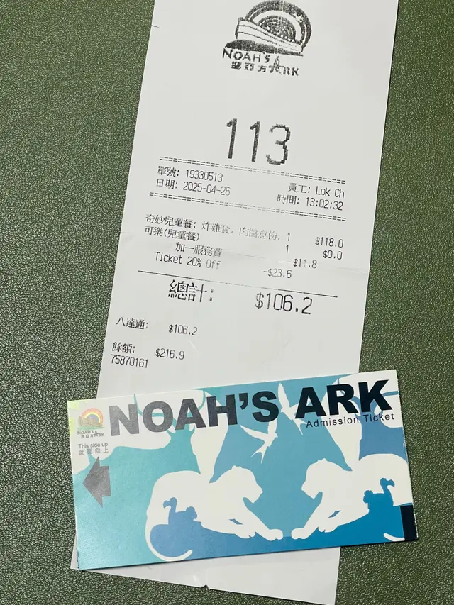 憑挪亞方舟入場券,點餐享有八折,所以買單嘅時候記得要出示🥰