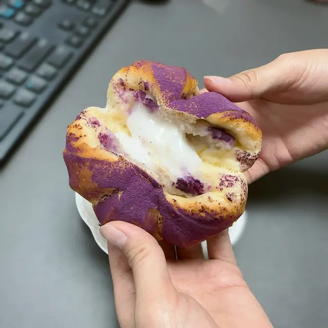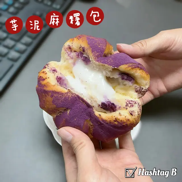 芋泥麻糬包面頭撒咗一層紫薯粉,