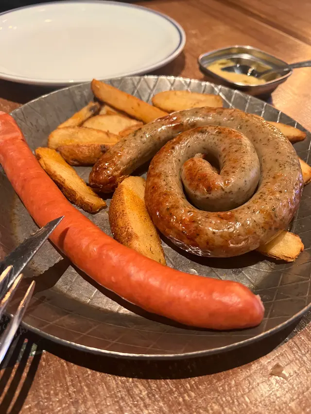 餐牌提議1-2人份量,有紐倫堡粗粒豬肉腸、維也納幼滑豬肉腸同炸薯仔,兩種腸都味道十足,個人喜歡紐倫堡腸既質地,好有咬口,炸薯仔好熱好脆,如果人數多可以選擇大size既德式香腸拼盤($280),可以品嚐埋牛肉腸同脆皮腸