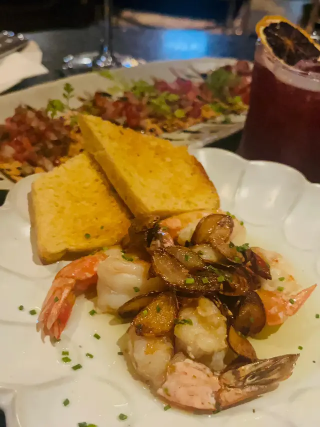 大蝦鮮嫩多汁,蒜片及橄欖油賦予其濃郁香氣,搭配Q彈的佛卡夏麵包,口感層次分明,非常下飯。