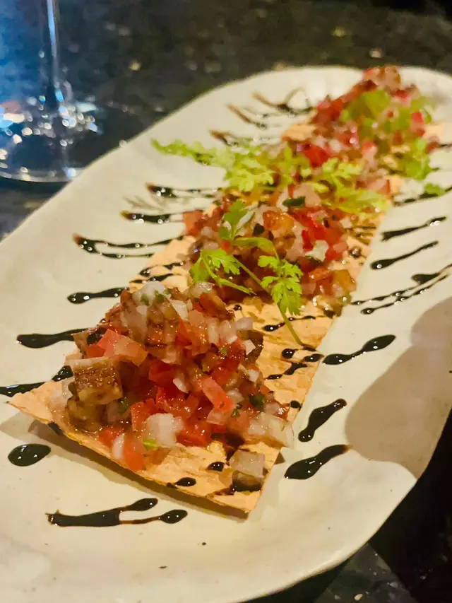 秘魯吞拿魚拌蕃茄莎莎配香烤鱈魚脆片及黑醋汁