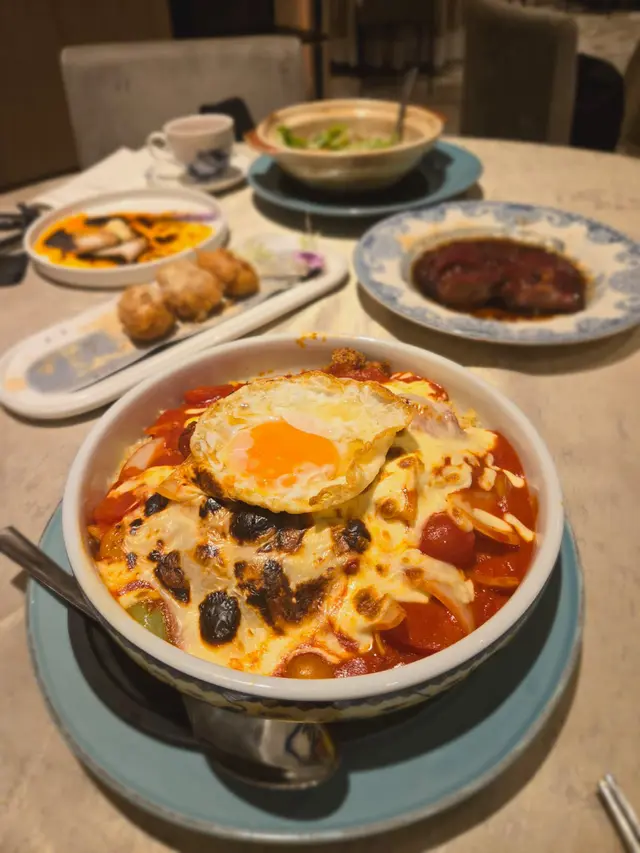 一上枱就好香芝士同茄香,流心蛋液配芝士拌飯好正;豬扒以吉列酥炸,外脆内嫩;炒飯底乾爽,唔係普通白飯,原來混有黑野米,有口感;成碟無油淋淋,係高級版焗豬👍🏻