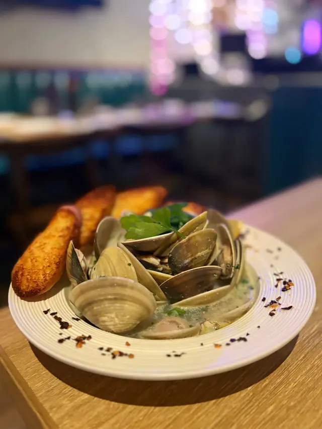 香蒜牛油煮蜆:以為平平無奇,竟然係呢個晚餐最驚喜嘅一道菜。大蜆體型大隻,肉質飽滿,吐沙乾淨。汁底非常鮮甜,絕對可以當湯飲,酌量加入碟邊嘅辣椒碎,微辣更顯鮮味。伴碟嘅法包灑上芝士碎再焗,鹹香酥脆。如果想食得豐富啲,加$188可以轉成海鮮拼盤。