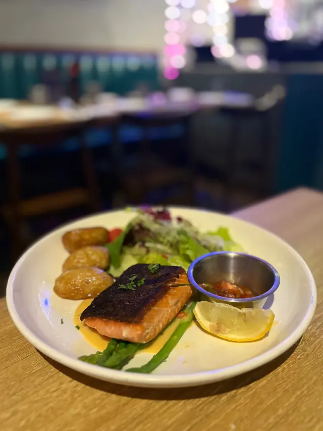 煎三文魚配酸辣龍舌蘭忌廉汁:魚皮朝脆,魚肉唔會太嚡,熟度剛好。一旁嘅薯仔同埋蘆筍都唔馬虎,薯仔輕輕炸過,烤蘆筍清甜爽脆。