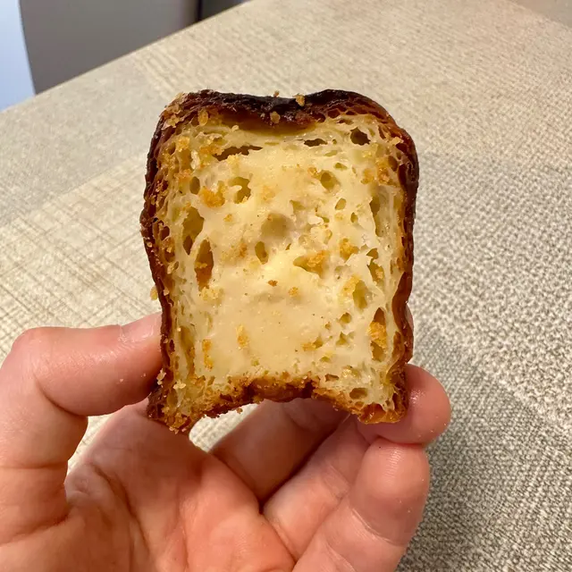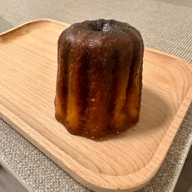切開後孔洞均勻,外皮煙韌帶點焦糖香,內餡濕潤綿滑有彈性,帶淡淡雲尼拿香,甜度不高