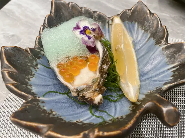 上桌覆以泡沫和彩花,帶清涼香氣;蠔身飽滿甜淨,擠點檸檬更醒胃。