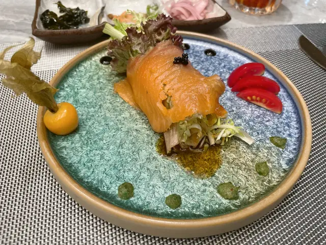 以煙三文魚包著蔬菜絲,面點少量魚子。三文魚鹹香不搶,底部微酸汁收尾清爽,擺盤精緻。