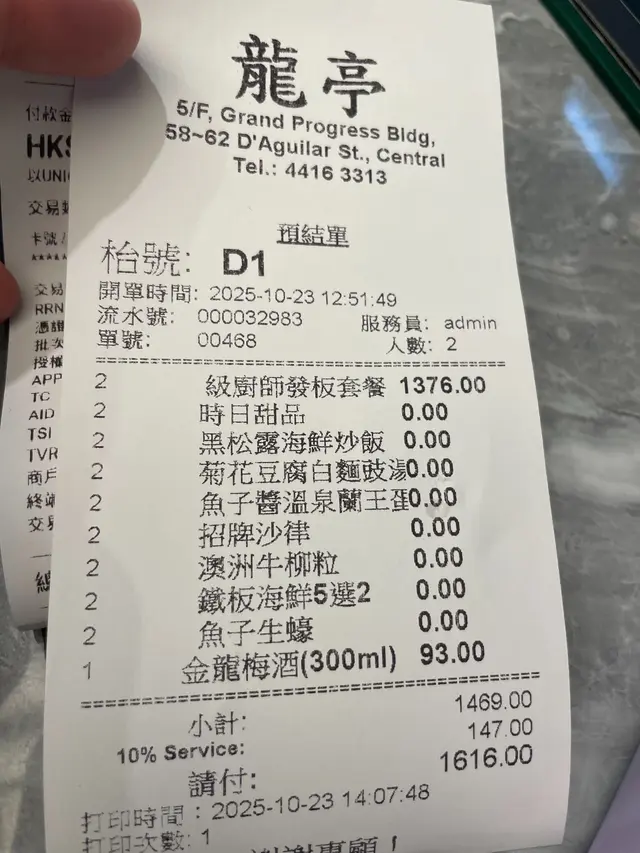 當天兩位點兩份十一品套餐加梅酒,小計$1,469,加一後$1,616。以中環地段、食材用料與體驗感,屬合理偏上;若只想輕鬆試水,可先選套餐,不必額外加點。