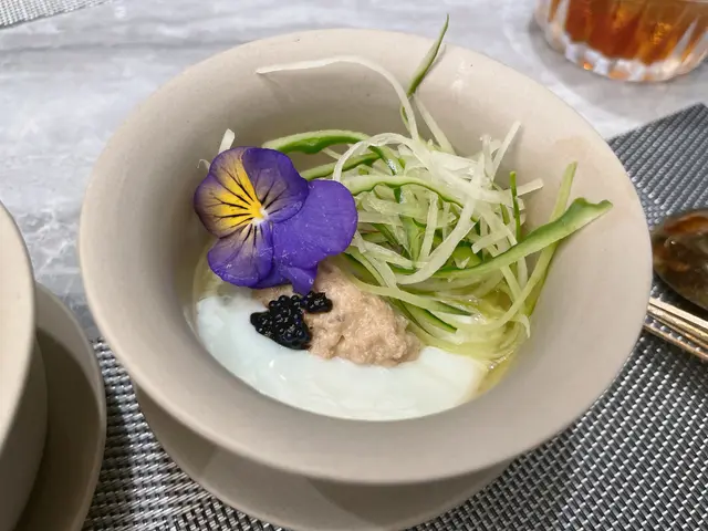 半熟蛋滑到像奶凍,上有白松露與魚子,加青瓜絲增爽脆層次。以匙舀破蛋黃拌匀,濃味白松露與蛋白感交疊,是本餐最喜歡的小碗菜。