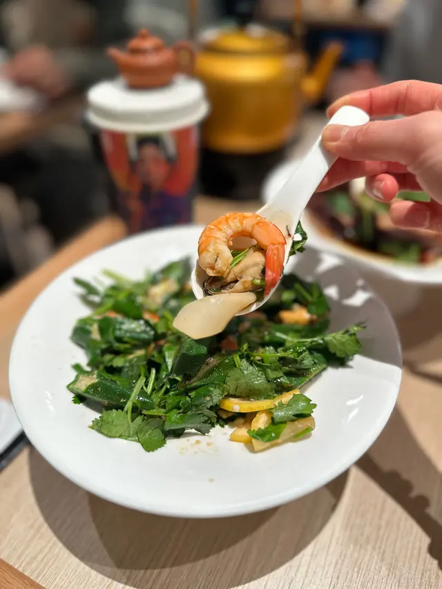 秋葵、大蝦、青口、魷魚,拌上涼拌芫荽,清爽中帶著海鮮的鮮甜。