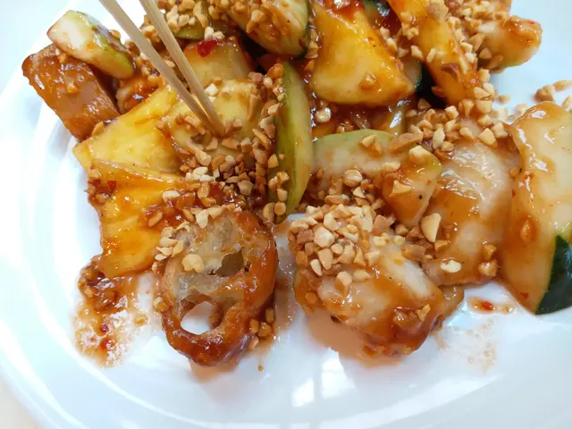 加甜辣汁同花生碎做成,生果中,大部份係番石榴同菠蘿,其次係青瓜同梨,呢個唔太辣,幾好味,但加埋腍咗嘅油炸鬼,感覺有啲怪,或者呢個係地道新加坡小食啩.