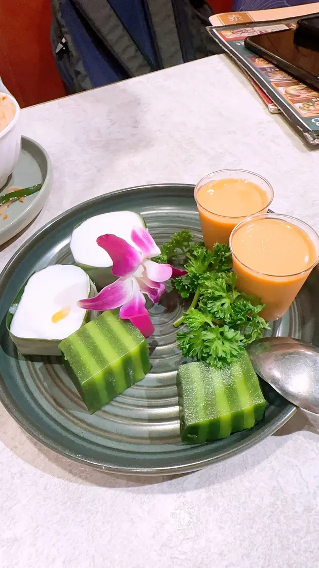 最後個泰式甜品拼盤真係靚到唔似真,完全係飯後完美ending, 係經典椰汁西米糕,白白嫩嫩,上面仲有少少椰絲同黃豆粉,咬落肯定軟糯香滑,滿口椰香。仲有綠色條紋嘅係班蘭椰奶果凍,顏色翠綠得像塊翡翠,食落清新班蘭香+濃濃椰奶,冰涼彈牙,超解渴。同埋兩杯迷你布丁,奶荼味好誘人,表面仲有氣泡,睇得出夠creamy夠滑。