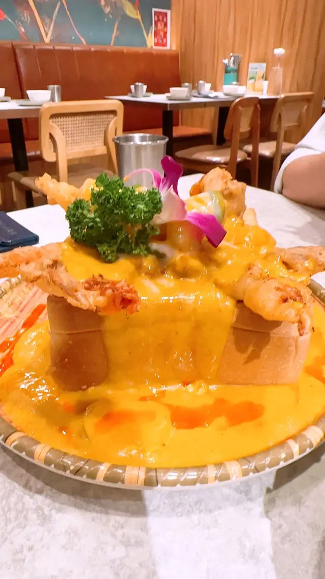 至於個焗黃咖喱麵包軟殼蟹真係誇張到爆燈, 隻軟殼蟹炸到金黃酥脆,成隻企喺度好霸氣,然後整隻被熱辣辣、香濃到痺嘅泰式黃咖喱淋到滿瀉,咖喱汁稠到發亮,睇得出落足椰奶同香料,香到隔籬枱都聞到, 最正係個麵包底!原塊厚切吐司被咖喱浸到軟熟但仲有啲脆邊,一啖咬落去係「鬆軟+酥脆+咖喱爆香」三重口感,仲要吸晒汁,超邪惡。