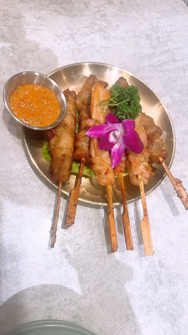 碟串燒沙嗲睇落真係好正啊,成排肉串烤到金黃色,表面仲有少少焦香,油光閃閃,超級惹味,肉串食落去好彈牙,肉串就肥瘦均勁,咬落去好juicy。跟住個沙嗲醬,顏色夠濃稠,聞落都應該好香蒜好香辣花生,蘸一蘸絕對係升天級享受,仲要用個銅碟盛住,好有泰國街頭feel。