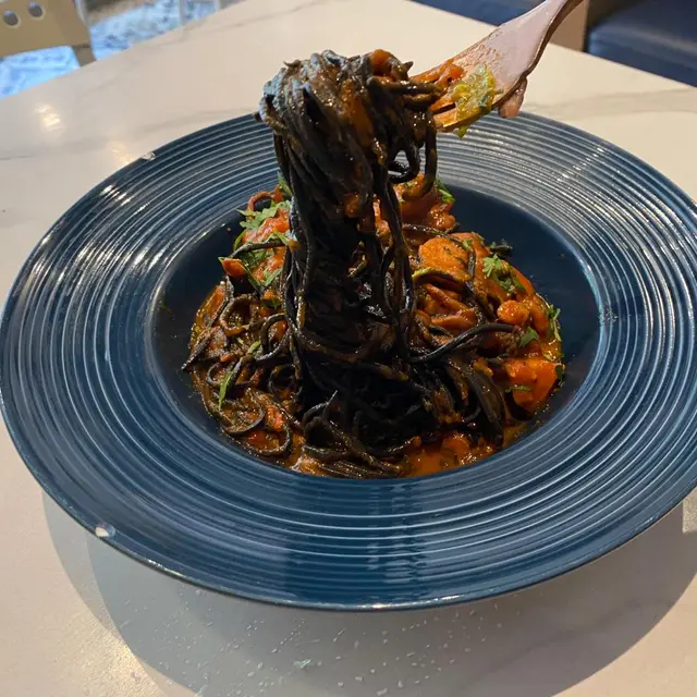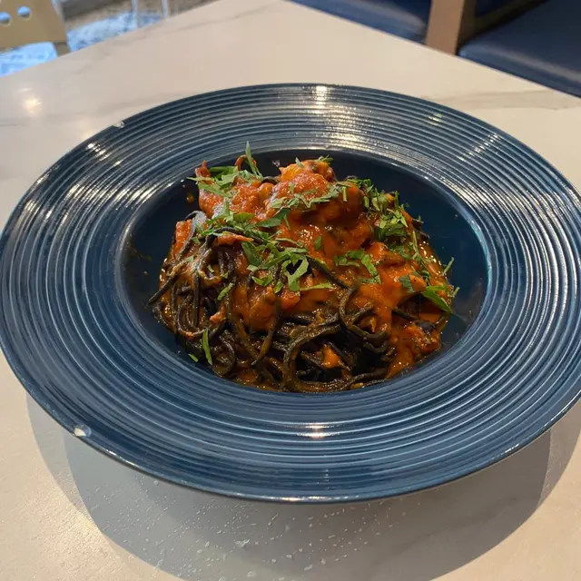主菜有墨魚麵,不是墨汁麵,不會食到一口黑色,爽口而彈牙的墨魚麵配上辣椒蕃茄醬,微辣開胃,還有數隻八爪魚仔,賣相不錯。