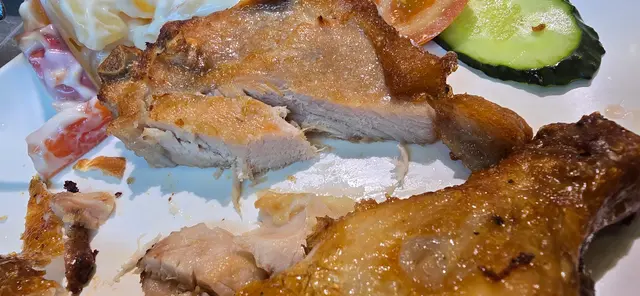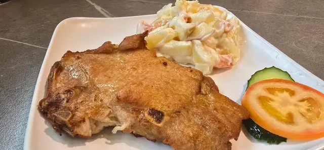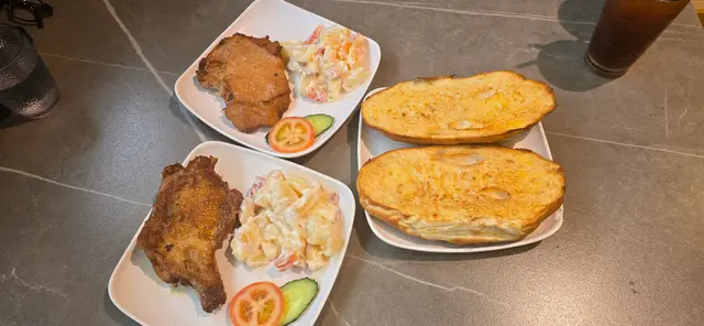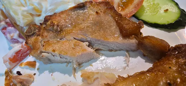 一坐下,飢餓嘅我哋即刻點咗沙律配炸雞脾同招牌厚豬扒。