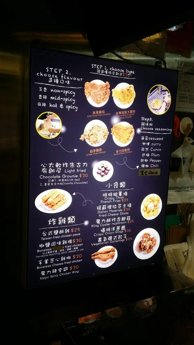 旺角「魔法雞排」售賣的雞排食品,款式還是跟昔日紅磡店「魔法雞排」的五款招牌雞排,「多力滋雞排」、「拍手雞排」、「胖果雞排」、「手掌芝心雞排」,還有「台灣超級大雞排」。