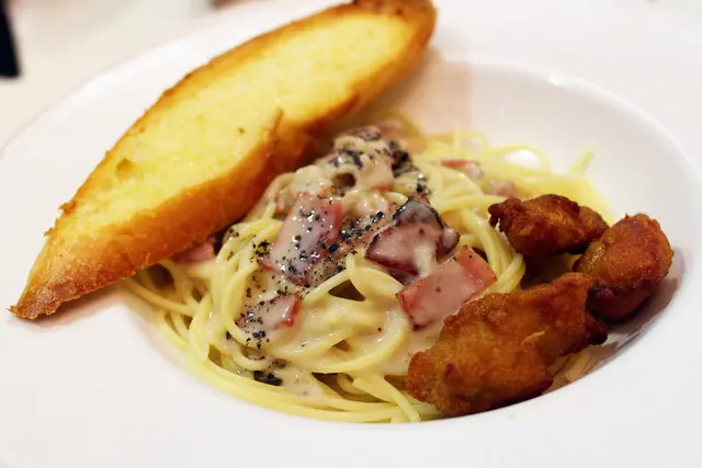 那是個吃完大早餐,skip 了午餐的週天,來到點份 白汁蘑菇黑松露炸雞意粉 吃吧!別給那些黑松露碎騙倒,意粉真是淡出個鳥來,當然這樣也有好處,就是適合幼兒食用。同上的蒜包就算脆身可以,炸雞又再次不知所謂。不過這樣一份意粉連飲品只 $62,的確又不貴。