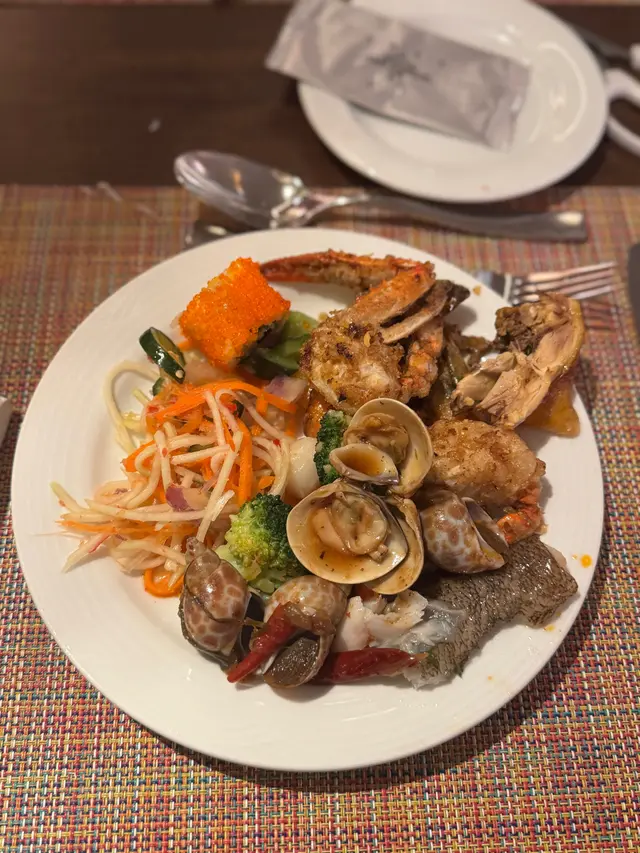 熟食方面有叉燒、油雞、pizza、雞翼、咖喱,特色酸菜魚、辣酒煮花螺、蒸魚羊扒避風塘炒蟹、豉油王炒蝦等等,而且會每人送一隻海邊蒜蓉蒸龍蝦連粉絲,味道正正常常龍蝦唔會似擦子膠。