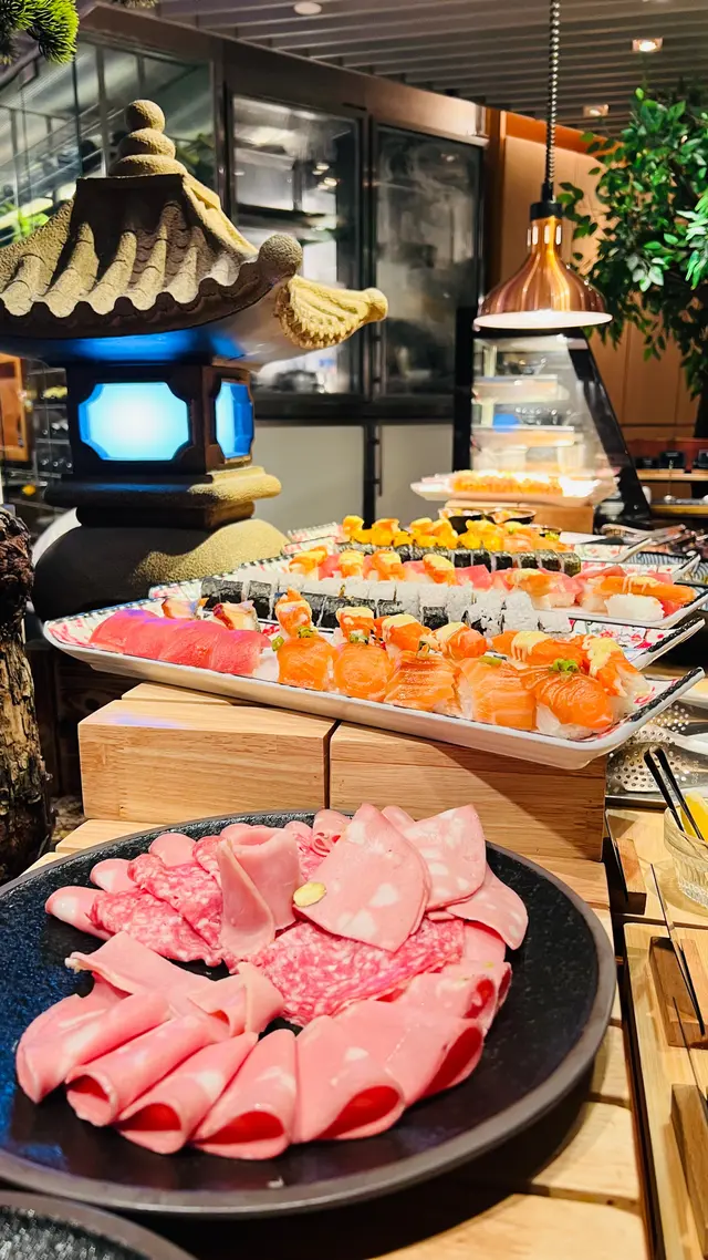 我哋18:30準時到達餐廳,唔使點排隊就可以直入用餐位置😘 冇幫襯cafe TOO 一段時間,所有嘅擺設都變得不一樣。用餐區嘅中央,以荷花園🪷為主題,裝飾得色彩繽紛,周圍滿佈各式各樣嘅 #甜品 同#水果,視覺效果滿分💯