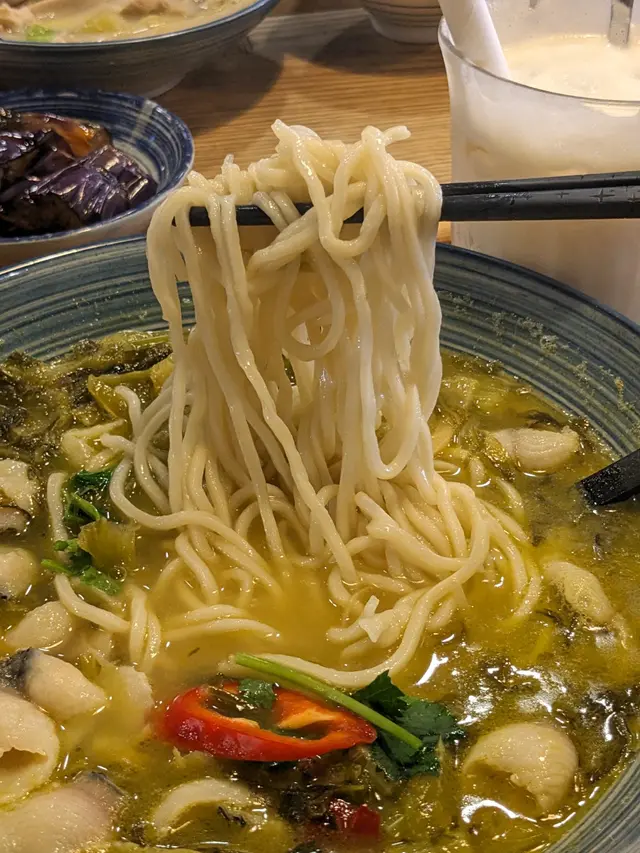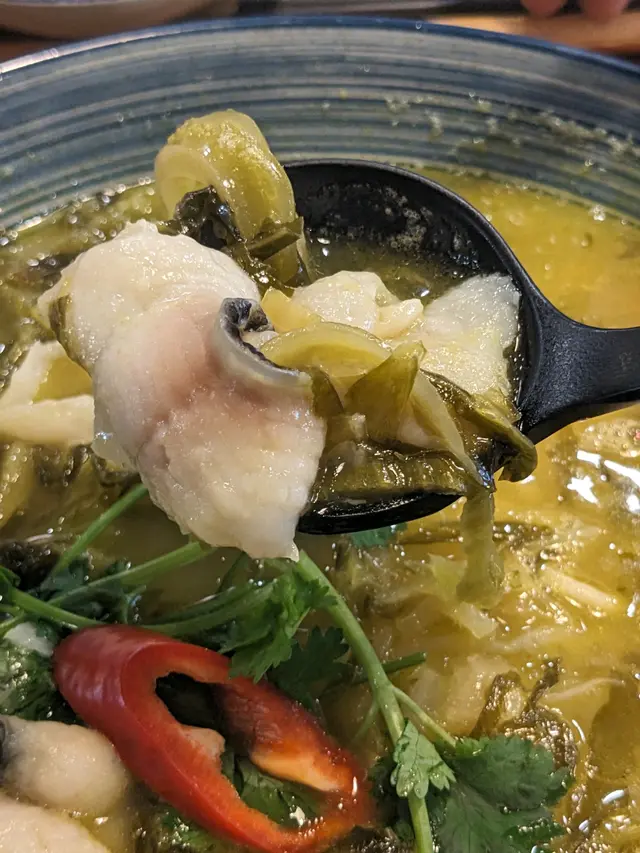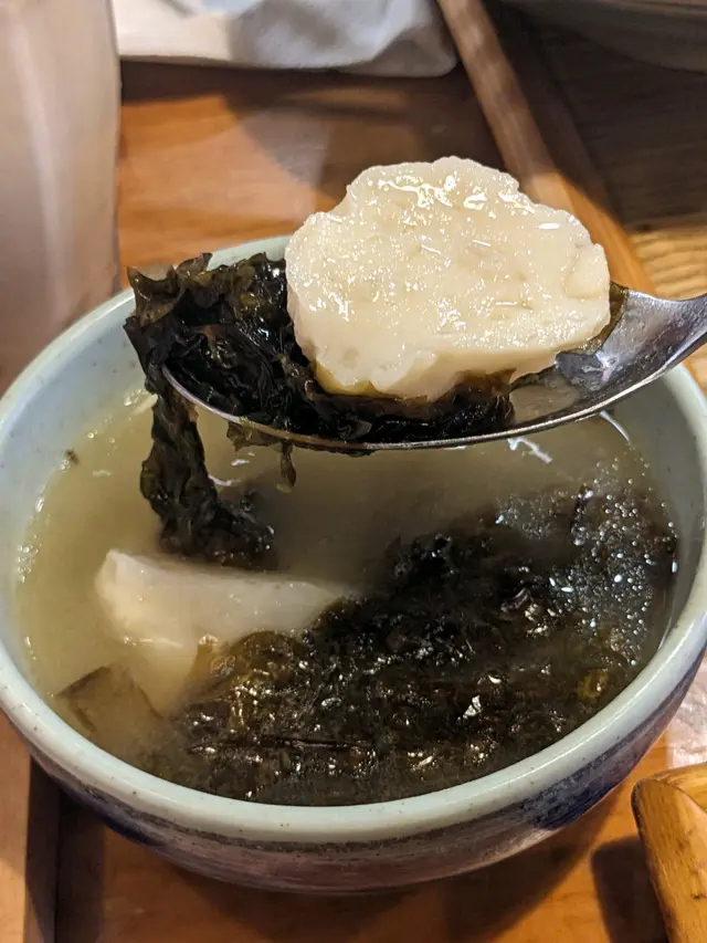另一主食是「秘罈酸菜魚台灣麵」($78),原本是米線但我選擇轉為台灣麵,口感更有嚼勁。酸菜魚湯底酸辣開胃,魚片滑嫩,配上紫菜魚丸湯($16)更添鮮味,魚丸彈牙,紫菜清香,整體層次豐富。