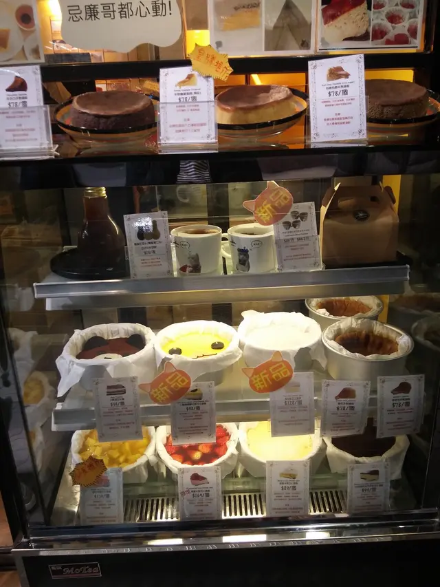 數月裡突然多了數款新品!引起眼球的是「CUP」 CAKE-印有可愛貓忌廉哥陶瓷杯內的半熟蛋糕和卡通造型的CHEESECAKE。原本想選一個CUP CAKE ,一個卡通造型的CHEESECAKE,但我不太好苦的tiramisu,又怕友人不吃得酸,便選了比利時朱古力溶心芝士蛋糕。又因為選了朱古力味的大CAKE,CUP CAKE 便選了蜂蜜味道。